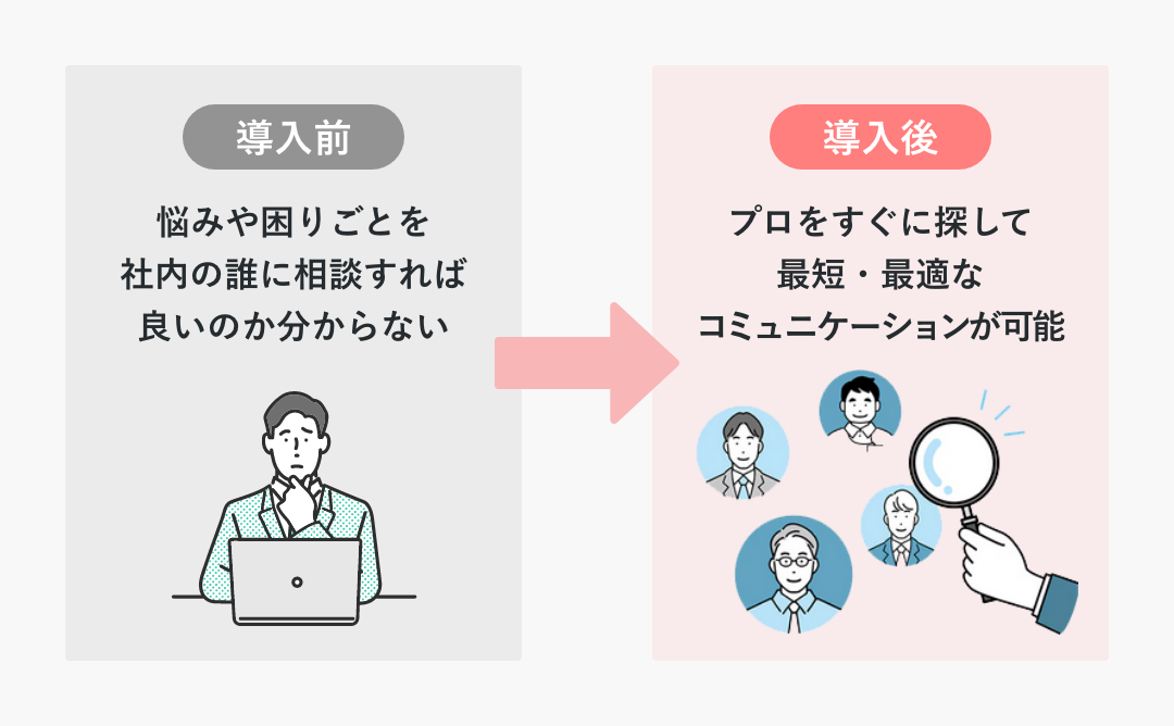 誰に相談すべきか迷う時間を削減し、ビジネスを加速させます。最適な相談相手を素早く見つけ、問題解決までの時間を短縮できます。