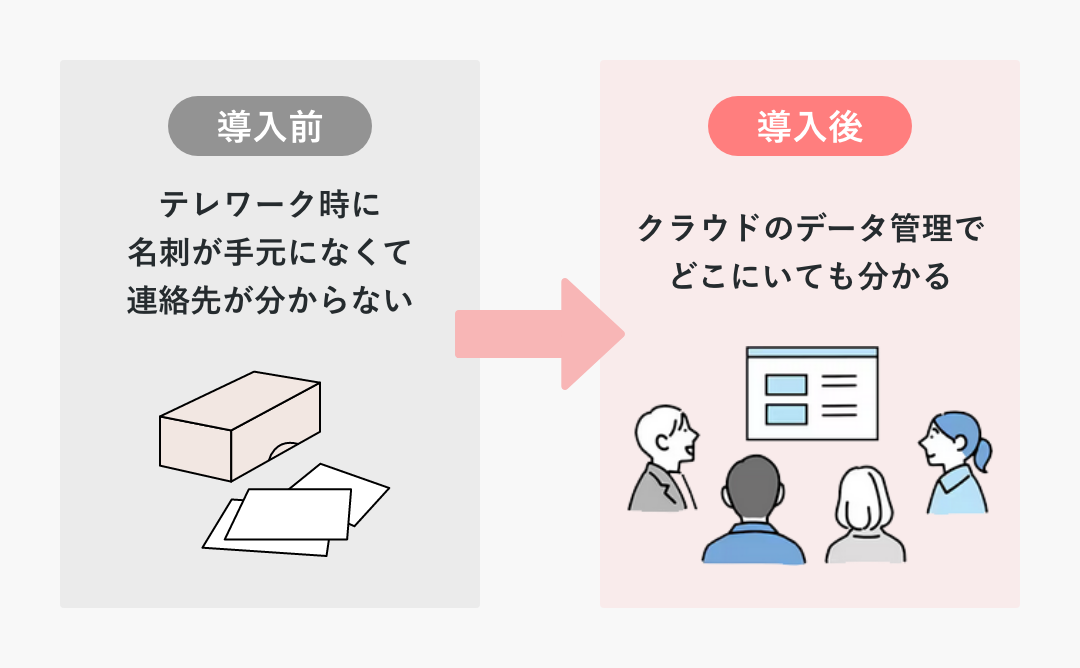 テレワーク環境で、名刺情報を含む社内外の連絡先が確認できないという課題を解消します。データはすべてクラウドにあるため、場所を問わずいつでもアクセス可能です。